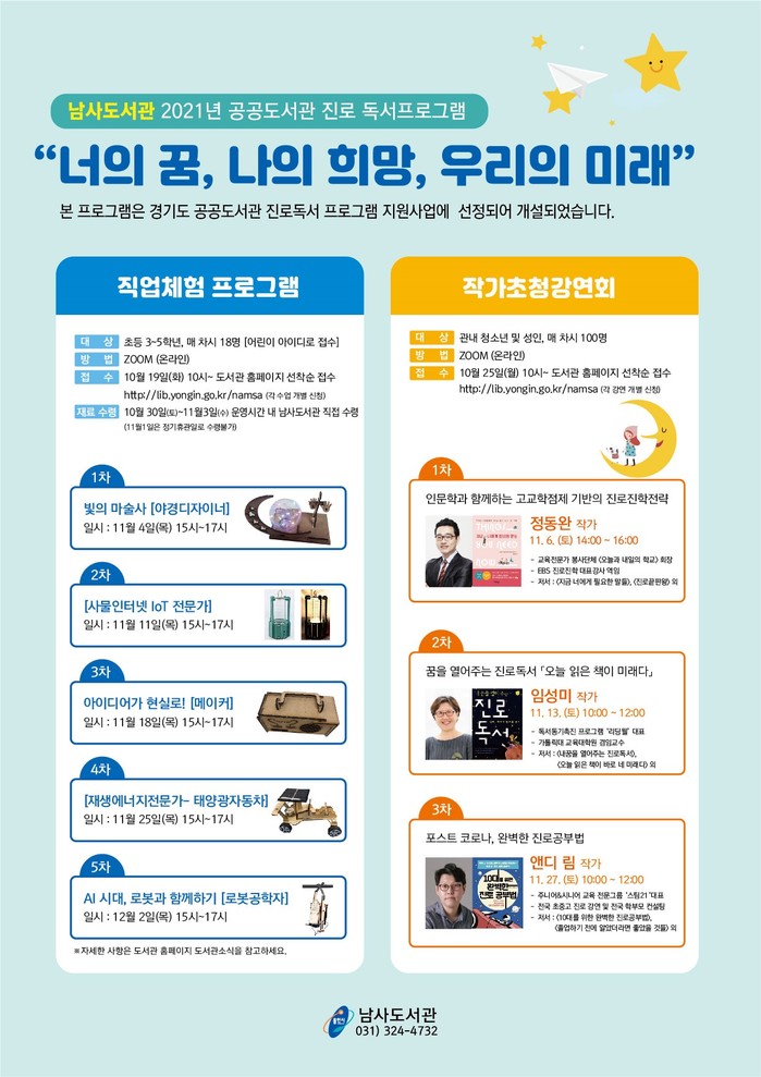 [용인=오왕석 기자] 용인시 남사도서관은 청소년의 진로·진학 고민 해결을 위한 ‘작가초청강연회’와 다양한 직업을 체험해 볼 수 있는 ‘직업체험 프로그램’을 비대면으로 운영한다고 25일 밝혔다.