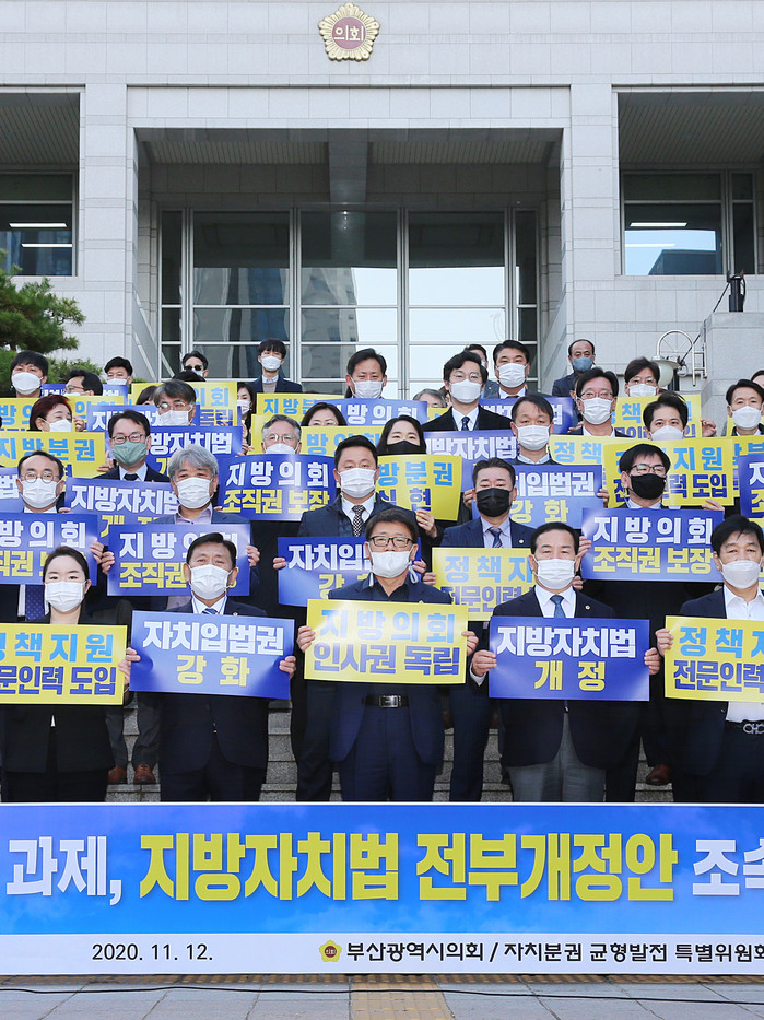 부산시의원들이 12일 오전 부산시의회 정문 앞에서 지방의회의 자치권과 자율성 확보를 위한 '지방자치법 전부개정 법률안'의 조속한 국회 통과를 촉구하고 있다.