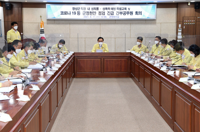 창녕군(군수 한정우)은 지난 9일 군청 앞 집회에서 제기된 2015년도 창녕군 직장 내 성폭력 의혹 사건과 관련해 2차 피해를 예방하고, 유사한 사례가 더 이상 발생하지 않도록 하기 위해 11일 오후 2시 군 군정회의실에서 휴가 중인 간부공무원까지 모두 긴급 소집하여 간부공무원 회의를 개최했다.