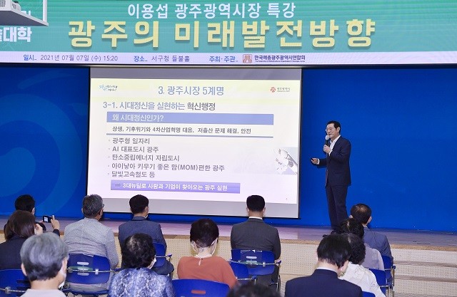이용섭 광주광역시장이 7일 서구청 들불홀에서 열린 제29기 광주예총 시민예술대학에서 ‘광주의 미래의 발전방향’이라는 주제로 특별강연을 했다.