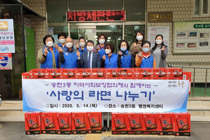 인천 동구 송현3동 지역사회보장협의체는 14일 코로나19 등으로 생활에 어려움을 겪는 지역내 저소득계층 50가구에 생필품(라면)을 전달했다. 사진은 전달식에 참석한 관계자들이 기념촬영을 하고 있는 모습. (사진제공=동구청)