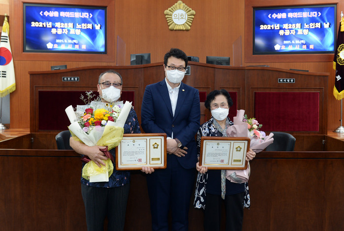 장인수 의장은 시상식에서 “그동안 국가와 지역사회 발전에 헌신하시고 어려운 시기에 지혜와 연륜으로 우리 사회를 이끌어 오신 어르신들께 감사와 존경의 마음을 드리며, 코로나19로 인해 기념식이 취소돼 안타깝지만 오산시의회는 앞으로도 어르신들의 행복한 노년을 위해 노인복지 증진에 최선을 다하겠다”라고 말했다.