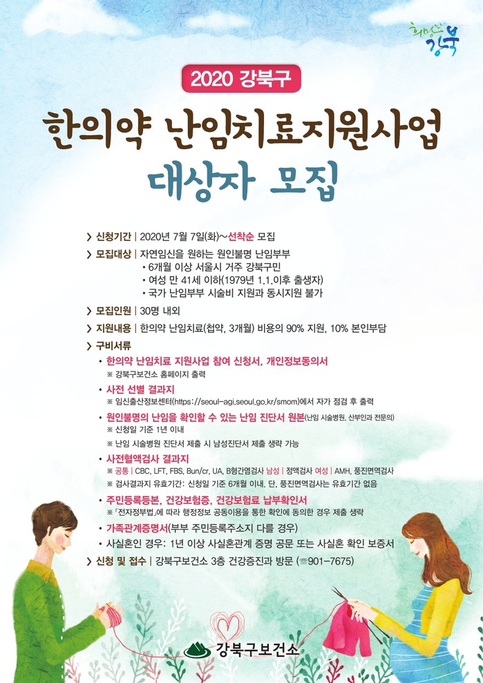 구에 따르면 대상은 자연임신을 원하는 원인불명의 난임부부로, 6개월 이상 서울시에 거주하고 있는 강북구민이어야며, 법적 부부 뿐만 아니라 사실혼관계의 부부도 해당된다.