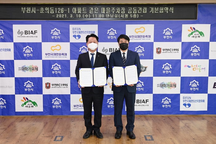 경기 부천시가 10일 시청 만남실에서 지역 주차난 해소를 위해 춘의동 126-1 일원 가로주택정비조합과 '제4호 아파트 같은 마을 주차장' 공동 건립을 위한 기본협약을 체결했다. 이번 사업은 전국 최초 민·관 공동으로 소규모주택정비사업이 사용하지 않는 지하 부분에 지역 주민이 이용할 수 있는 마을주차장(공영주차장)을 건립하는 것으로, 이날 협약에 따라 56면이 추가 설치된다. 사진은 장덕천 시장(왼쪽)과 김영철 조합장이 기념촬영을 하는 모습. (사진제공=부천시청)
