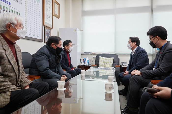 오세현 충남 아산시장이 신축년 새해를 맞아 5일 (사)대한노인회 아산시지회와 아산시노인종합복지관을 방문해 직원들을 격려하고관계자들과 면담을 했다. 사진은 오 시장이 대한노인회 아산시지회를 방문해 관계자들과 면담을 하고 있는 모습. (사진제공=아산시청)