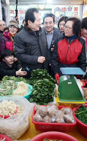 국무총리가 주말인 18 서울 중랑구 우림골목시장을 방문해 물가를 점검하며 상인과 대화하고 있다.