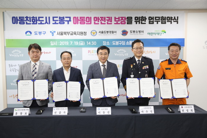 | ▲ 도봉구는 지난 7월 초록우산 어린이재단, 서울시북부교육지원청, 도봉경찰서, 도봉소방서와 함께 '도봉구 아동의 안전권 보장을 위한 업무협약'을 체결했다. |