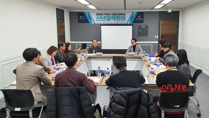 경기 부천시는 8일 복사골문화센터에서 한국만화영상진흥원과의 소통과 협력 강화를 위해 ‘2020년 만화산업육성 신년정책회의’를 개최했다. 사진은 관계자들이 의견을 나누고 있는 모습. (사진제공=부천시청)