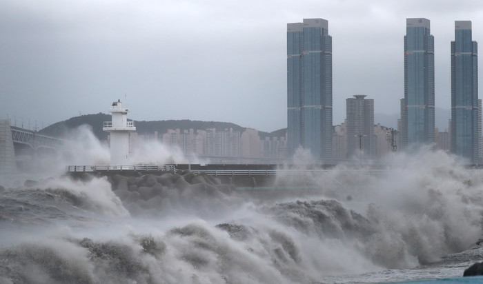 태풍 하이선이 북상 중인 7일 오전 부산 광안리 일대에 높은 파도가 몰아 치고 있다.
