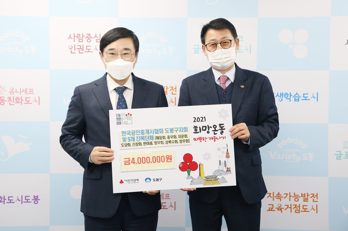 서울 도봉구는 지난 3일 한국공인중개사협회 도봉구지부 및 9개 지역단체로부터 저소득 주민들을 위한 2021 희망온돌 따뜻한 겨울나기 사업 성금 400만원을 전달받았다. 사진은 이동진 구청장(왼쪽)이 도봉구 지회장과 기념촬영을 하고 있는 모습. (사진제공=도봉구청)