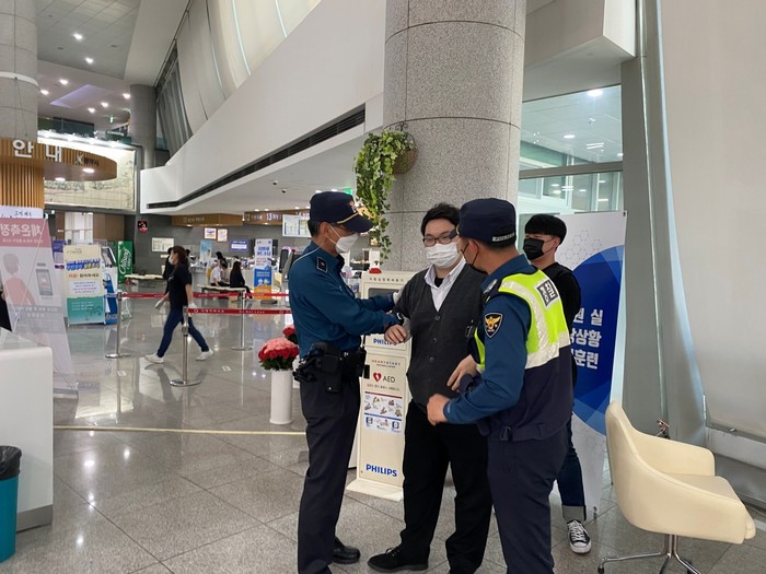 경기 광주시가 최근 광주경찰서(경안지구대)와 합동으로 '민원실 비상상황 대비 모의훈련'을 실시했다. 이번 훈련은 민원실 공무원에 대한 폭언 등 비상상황 발생시 신속한 대응으로 극단적인 상황을 방지하기 위해 마련됐다. 사진은 이날 모의훈련이 진행되고 있는 모습. (사진제공=광주시청)