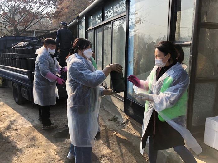 경기 포천시 송우고등학교 학부모회가 지난 14일 겨울철 한파에 취약한 노인들이 따뜻한 겨울을 보낼 수 있도록 저소득 홀몸노인 2가구에 연탄 1000장을 전달했다. 사진은 이날 연탄나눔 행사에 참여한 학교 관계자와 학생, 학부모들이 연탄을 직접 배달하고 있는 모습. (사진제공=포천시청)