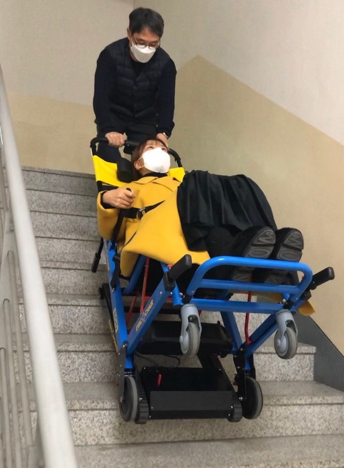 | ▲ 송파구 돌봄SOS센터 서비스제공 업무협약기관인 ㈜메이븐플러스에서 전동식리프트를 이용하여 몸이 불편한 주민의 병원동행을 돕고 있다. 전동식리프트는 엘리베이터가 없는 주택이나 빌라 계단을 오르고 내리도록 돕는 혁신적인 보조장치이다. |