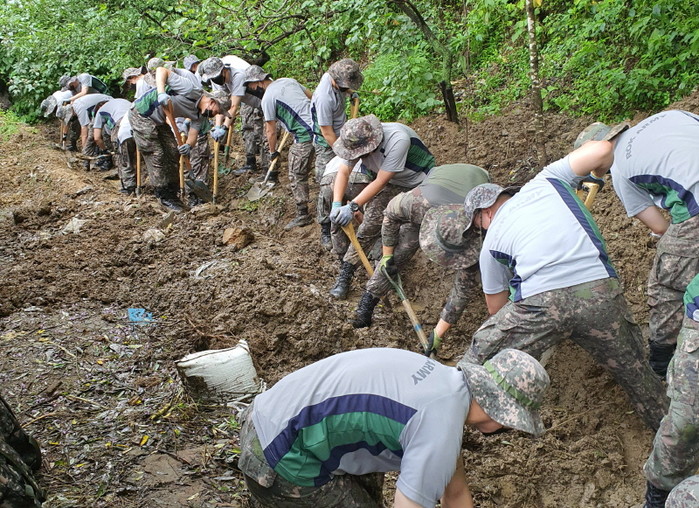 육군 5사단이 12일 경기 연천군 일대에서 대대적인 수해 복구 작업을 펼쳤다. 연천은 도에서 가장 피해규모가 큰 지역으로 5사단은 마전리·대광리·읍내리 지역에 침수피해 복구작업을 위해 장병 50여명을 긴급 투입했다. 사진은 장병들이 토사정비 등 수해복구 작업에 매진하고 있는 모습. (사진제공=연천군청)