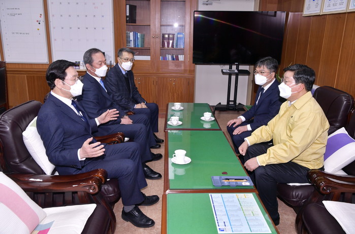 | ▲ 이용섭 광주광역시장이 9일 오후 동구 조선대학교 의과대학 1호관 학장실에서 전해철 행정안전부 장관과 환담을 갖고 코로나19 백신 호남권역접종센터 준비상황과 추진계획 등에 대해 의견을 나누고 있다./광주광역시 제공 |