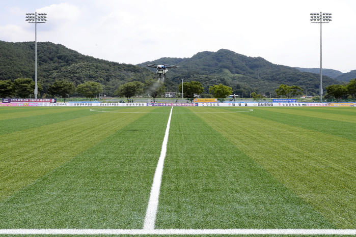 합천군은 21일 사회적거리두기 격상에 따라 전국고등학교축구대회 기간 중 감염병 사전 예방을 위해, 대회 경기장에 드론으로 항공방역을 하고 있다.
