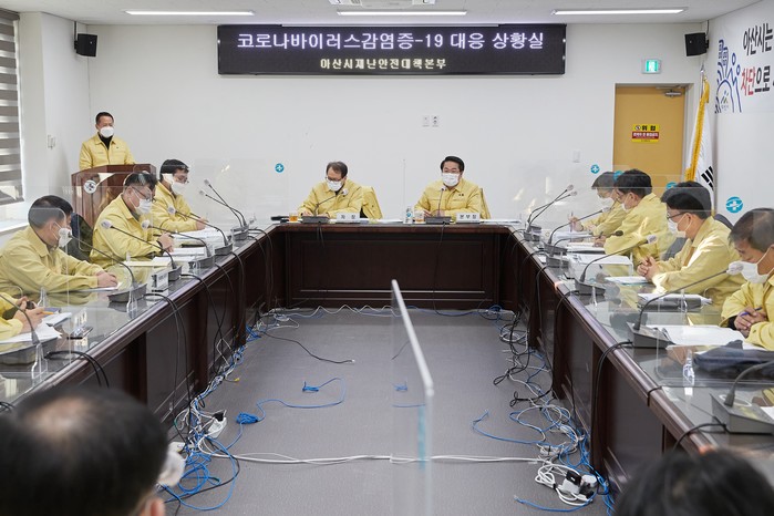 충남 아산시가 8일 보건소에서 오세현 시장 주재로 부서장급 이상 간부들이 참석한 가운데 코로나19 재난안전대책본부 회의를 개최했다. 이날 오 시장은 철저한 방역 관리와 함께 정부의 백신 접종 시행계획이 신속 이행될 수 있도록 철전한 사전 준비를 당부했다. 사진은 오 시장이 회의를 주재하는 모습. (사진제공=아산시청)