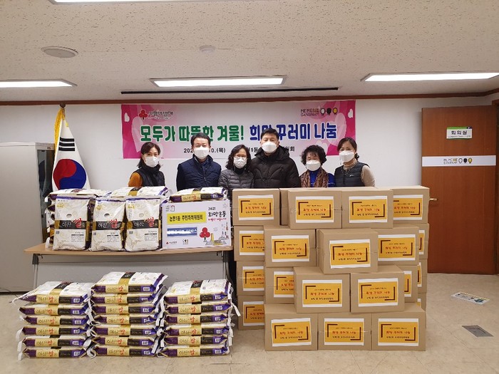 서울 강남구가 10일 논현1동 긴급복지 대상자 50가구에 주민자치위원들이 기부한 3만원 상당의 생필품과 간편식 등이 담긴 ‘희망 꾸러미’를 전달했다. 꾸러미는 주민자치위원들이 직접 긴급복지대상자 50가구를 방문해 비대면으로 전달했다. 사진은 전달식에서 관계자들이 기념촬영을 하는 모습. (사진제공=강남구청)
