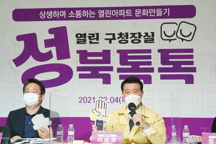 서울 성북구는 4일 온라인 실시간 토크콘서트 ‘성북톡톡 열린구청장실’ 공동주택 편을 실시했다. 공동주택 운영 관련 입주민 등 대표가 줌(ZOOM)을 통해 회의에 참가했고 유튜브로 실시간 방송됐다. 사진은 열린구청장실에서 이승로 구청장(오른쪽)이 참여자들과 실시간으로 소통하고 있는 모습. (사진제공=성북구청)