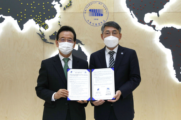 | ▲ 정순균 구청장(왼쪽)이 서울시립대학교와 업무협약을 체결하고 기념촬영을 하고 있다. (사진제공=강남구청) |