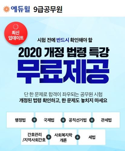 [시민일보 = 황혜빈 기자] 종합교육기업 에듀윌이 9급공무원 시험 전 꼭 확인해야 할 ‘2020년 개정 법령 특강’을 무료로 공개했다고 밝혔다.