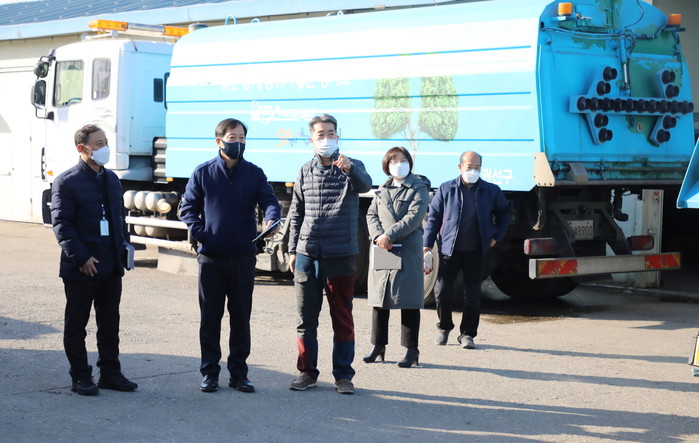 서경보 경기 수원시 권선구청장은 20일 고색동에 소재한 청소차 차고지를 방문해 권선구 청결을 위해 힘쓰고 있는 청소관련 공무원들을 격려했다. 사진은 서 구청장(왼쪽 두 번째)이 공무원들과 차고지 현장을 살펴보는 모습. (사진제공=권선구청)