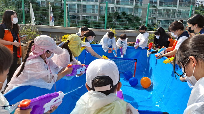 경기 하남시덕풍청소년문화의집은 최근 이틀간 하남시 청소년참여예산제사업-물놀이 운동회인 ‘잘가, 여름아’ 프로그램을 진행했다. 이날 청소년들은 낚시·물총 사격 등 물놀이를 즐기며 코로나19 장기화로 쌓인 피로 및 스트레스를 해소했다. 사진은 참여 청소년들이 물총 축구를 하고 있는 모습. (사진제공=하남시청)