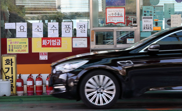 3일 경기 시흥의 한 주유소에 요소수 품절 안내문이 붙어있다. 요소수는 경유 차량에서 발생하는 발암물질인 질소산화물을 물과 질소로 바꿔주는 성분으로, 최근 중국이 자국 수요 부족 등을 이유로 한 수출 제한으로 인해 품귀 현상이 빚어지고 있다.