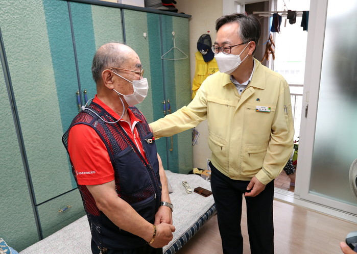 유성훈 금천구청장은 11일 광복절을 맞아 독립유공자 후손 3가구를 방문해 격려하고, 광복회 금천구지회를 방문해 간담회를 실시했다. 사진은 유 구청장(오른쪽)이 독립유공자 후손을 방문해 격려하고 있는 모습. (사진제공=금천구청)