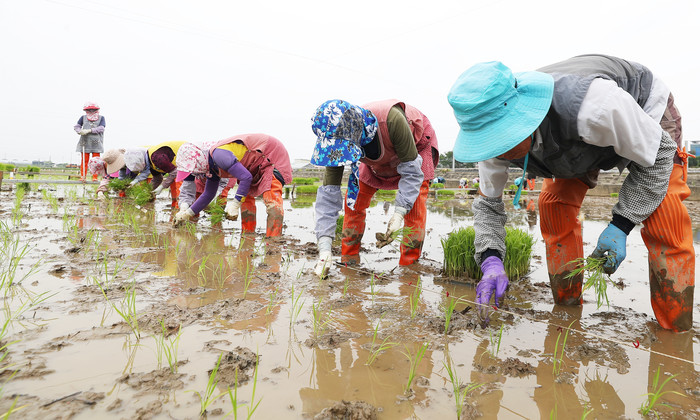 18일 오전 경기 화성시 경기도농업기술원에서 관계자들이 연구용 벼 손 모내기를 하고 있다.