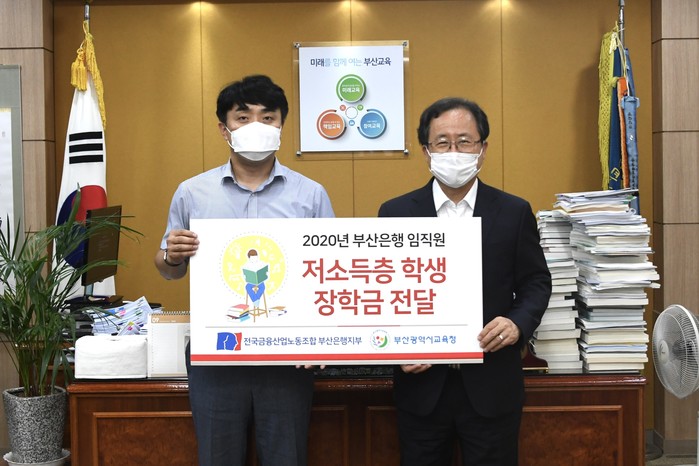 [시민일보 = 여영준 기자] 부산은행 노동조합이 16일 오후 부산시교육청에서 지역 저소득층 가정 중고등학생 지원을 위한 기부금 2000만원을 부산시교육청에 전달했다.