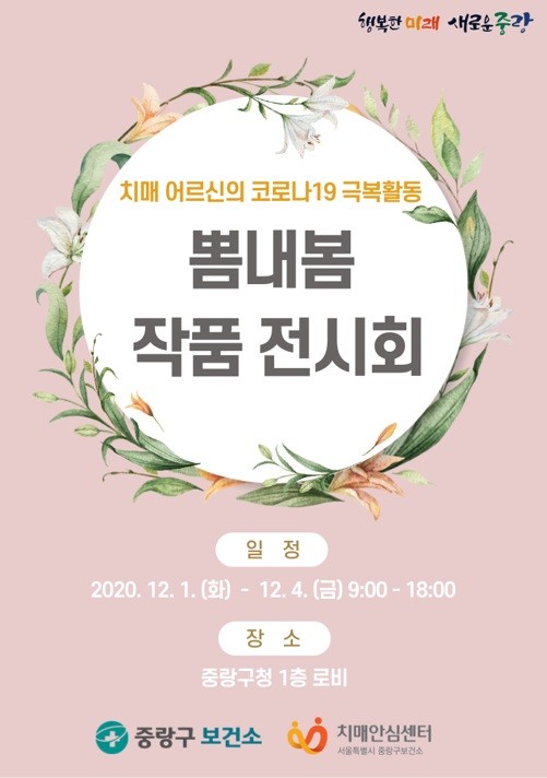 [시민일보 = 여영준 기자] 서울 중랑구(구청장 류경기)는 1~4일 구청 1층 로비에서 치매 노인의 예술 작품 전시회 ‘뽐내봄’을 개최한다고 밝혔다.