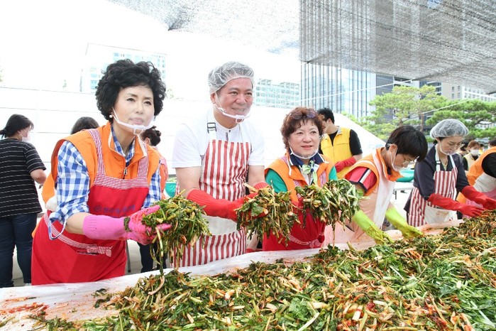 경기 안양시가 최근 취약계층을 위한 ‘사랑愛 여름김치 담그기’ 행사를 열었다. 이 행사에는 (사)안양시자원봉사센터 소속의 기업사회공헌팀 기관 관계자와 여성단체협의회 등이 참여했다. 사진은 최대호 시장(왼쪽 두 번째)과 행사 참가자들이 열무김치를 담그는 모습. (사진제공=안양시청)