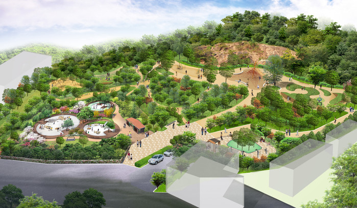 또한 자연 지형과 지물을 활용한 숲속놀이마당, 숲관찰산책로, 숲속교실, 놀이언덕 등을 통해 자연과 계절의 변화를 담을 수 있는 친환경놀이터로 조성된다.