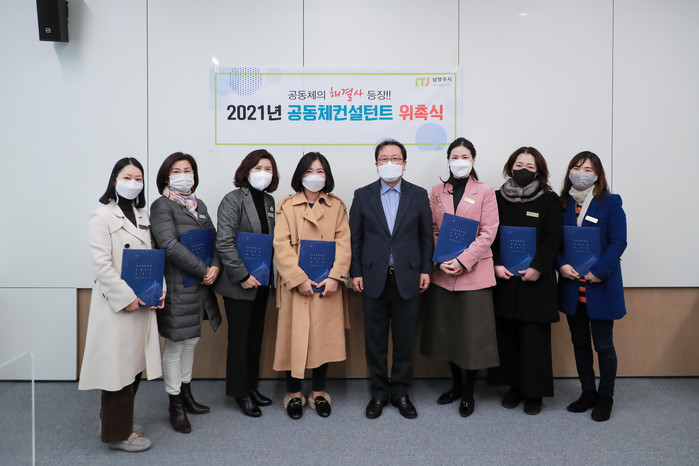 경기 남양주시가 29일 시청 이석영마루에서 2021년도 공동체 컨설턴트 위촉식을 열고 공동체 사업에 뛰어난 전문성을 가진 7명에게 위촉장을 전달했다. 사진은 조광한 시장(오른쪽 네 번째)이 위촉장을 전달한 후 컨설턴트들과 기념촬영을 하는 모습. (사진제공=남양주시청)