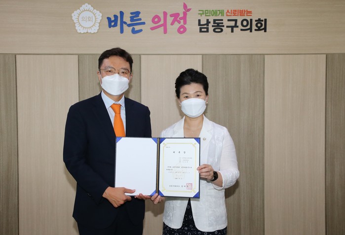 | ▲ 임애숙 의장(오른쪽)과 김도훈 변호사가 기념촬영을 하고 있다. (사진제공=인천 남동구의회) |