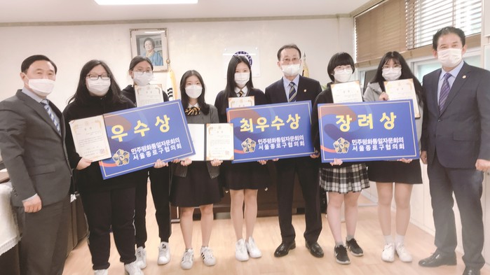 [시민일보 = 이대우 기자] 정재호 서울 종로구의회 의원이 최근 상명대학교사범대학부속여자고등학교에서 열린 2020 도전! 통일 골든벨 행사에서 입상한 학생들에게 상장을 수여했다.