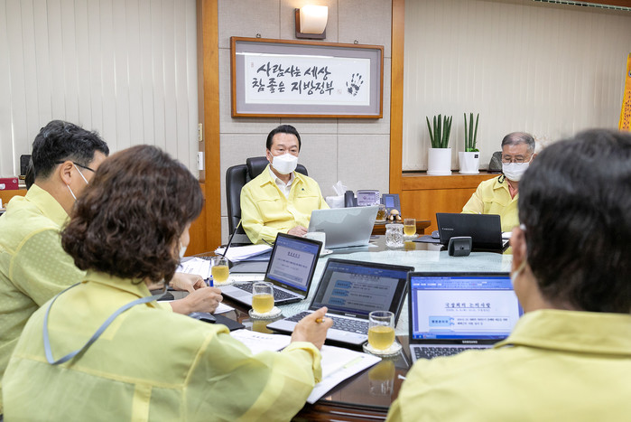 강서구는 지난 13일 사회적 거리두기 1단계 하향 조정에 따른 코로나19 긴급 대책회의를 했다. 사진은 노현송 구청장(가운데)이 부구청장, 국장, 소관 부서장이 참석한 가운데 회의를 주재하고 있는 모습. (사진제공=강서구청)