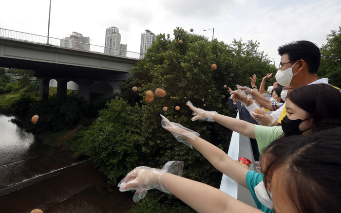 서울 송파구 잠실4동 주민자치회는 환경의 달을 맞아 15일 송파둘레길 성내천에서 EM흙공 던지기 행사를 했다. 행사는 EM흙공 만들기·EM흙공 성내천에 던지기 등 주민 참여형 프로그램으로 진행됐다. 사진은 박성수 구청장(가운데)이 주민들과 함께 EM흙공을 성내천에 던지고 있는 모습. (사진제공=송파구청)
