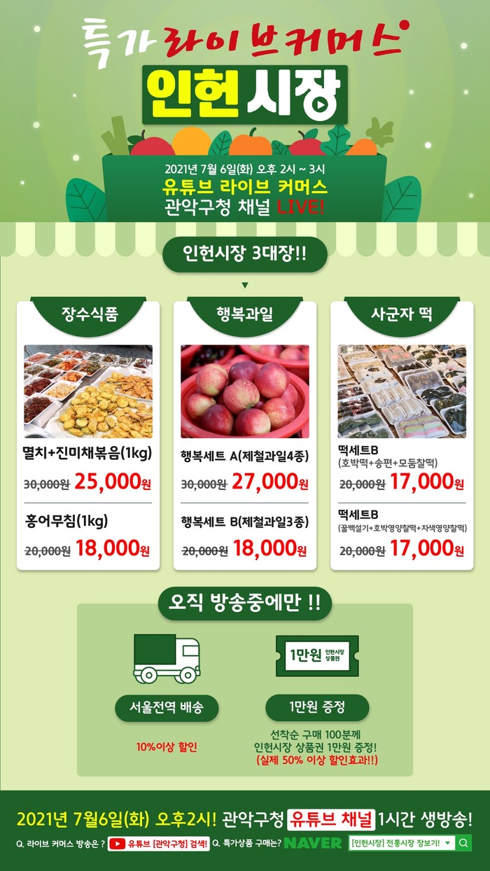 먼저, 인헌시장 내 반찬, 과일, 영양떡을 판매하는 3개 점포를 대상으로 ‘특가라이브 커머스’를 추진, 6일 오후 2~3시 구청 공식 유튜브 ‘라이브관악’에서 생방송으로 진행한다.