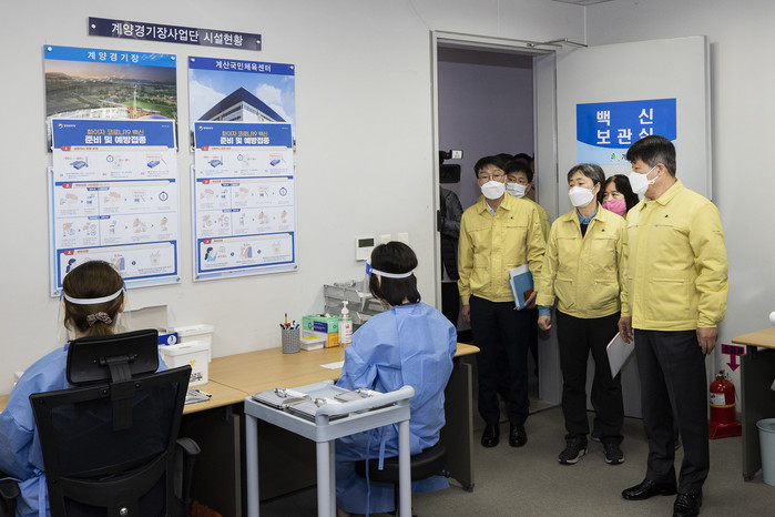 인천 계양구가 오는 22일 본격 가동하는 계양아시아드 양궁장 코로나19 예방접종센터의 원활한 운영을 위해 15일 예방접종 모의훈련을 했다. 이번 모의훈련은 예방접종 대상자의 동선에 따라 센터 방문부터 접종, 이상반응 모니터링까지의 모든 과정을 점검하고 문제점을 개선하고자 준비됐다. 사진은 이날 모의훈련에 앞서 센터 시설 현황을 최종 점거하는 박형우 구청장(오른쪽)의 모습. (사진제공=인천 계양구청)
