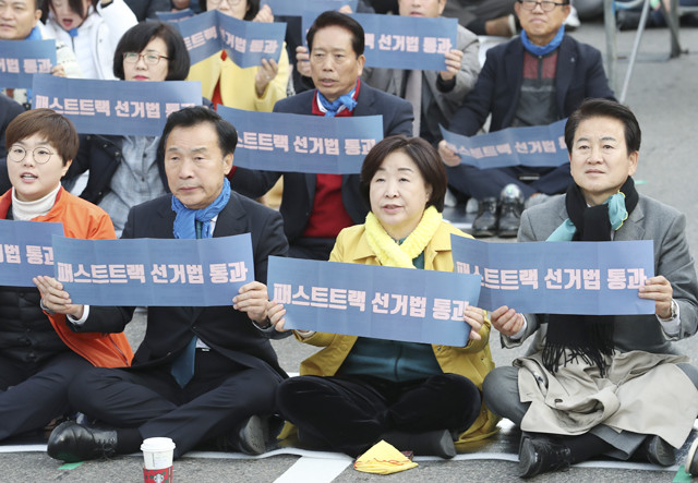 오후 여의도 국회 앞에서 열린 2019 선거제도 개혁을 위한 여의도 불꽃집회에서 바른미래당 손학규 대표(왼쪽 번째부터), 정의당 심상정 대표, 민주평화당 정동영 대표가 패스트트랙 선거법 통과를 촉구하는 피켓을 들어 보이고 있다.
