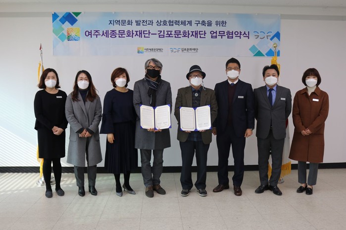 경기 여주세종문화재단과 김포문화재단이 최근 지역문화 발전과 상호협력체계 구축을 위한 업무협약을 체결했다. 협약 내용은 자료 공유 및 인적 교류, 학술연구 교류 등이다. 사진은 업무협약식에서 관계자들이 기념촬영을 하는 모습. (사진제공=여주시청)