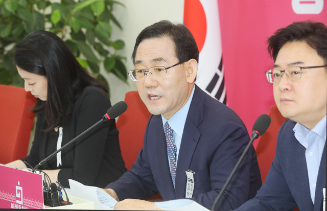 미래통합당 주호영 원내대표가 5일 국회에서 열린 현안 간담회에서 국정조사 추진ㆍ인사청문·상임위 보임계 제출 등 국회 복귀 구상에 대해 밝히고 있다. 오른쪽부터 김성원 원내수석부대표, 주호영, 배현진.