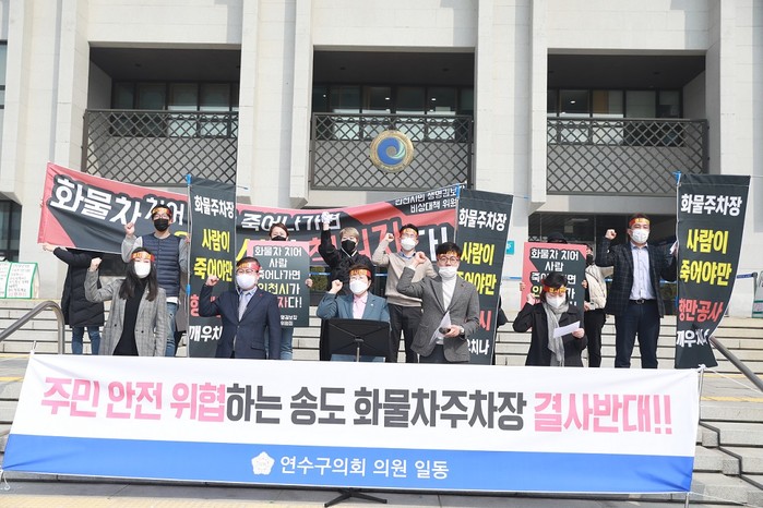 이날 성명서 발표에는 연수구의회 김성해 의장, 이강구 부의장, 기형서 운영위원장, 조민경·정태숙 의원과 연수구 주민들이 참여했다.
