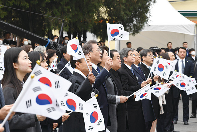 문재인 대통령과 김정숙 여사가 1일 종로구 배화여고에서 열린 3.1절 기념식에서 3.1절 노래를 부르고 있다.