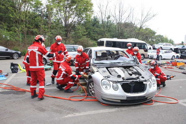 서울 중랑소방서는 최근 일산 식사동 소재 인선모터스 폐차장에서 폐차를 활용해 구조대원을 대상으로 교통사고 대비 특별구조훈련을 실시했다. 소방서는 다양한 교통사고 상황을 가정하고 구조대원의 현장대응능력 향상에 중점을 두고 훈련을 진행했다. 사진은 소방관들이 구조 훈련을 하고 있는 모습. (사진제공=중랑소방서)