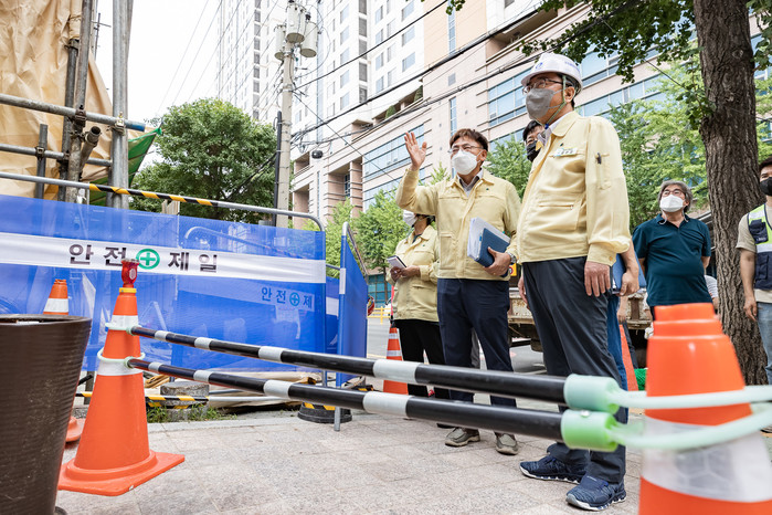 김선갑 서울 광진구청장은 12일 구의동 건물 철거 현장을 방문해 안전점검을 실시했다. 이번 안전점검은 지난 10일 중장비로 활용해 폐기물을 처리하는 과정에서 발생한 진동 등으로 가림막이 넘어진 사고가 발생함에 따라 추진됐다. 사진은 이날 현장을 방문한 김 구청장(오른쪽)이 안전점검을 하고 있는 모습. (사진제공=광진구청)