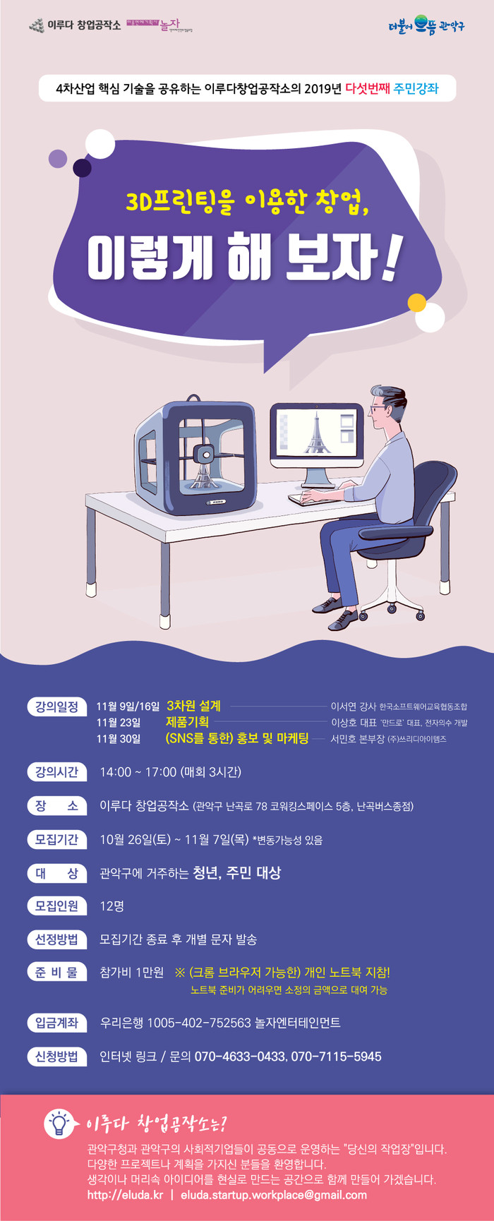구에 거주하는 주민이면 누구나 신청이 가능하며, 교육신청은 이루다 창업 공작소 홈페이지 또는 구 민·관협치과를 통해 하면 된다.