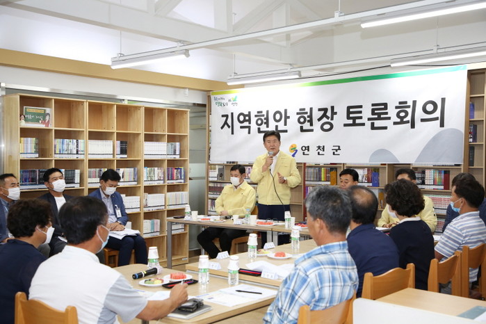27일 경기 연천군은 청산면 궁평 권역의 활성화를 위한 지역 현안 현장토론회를 열고, 현장의 다양한 의견을 청취했다. 사진은 토론회에서 김광철 군수가 발언하고 있는 모습. (사진제공=연천군청)